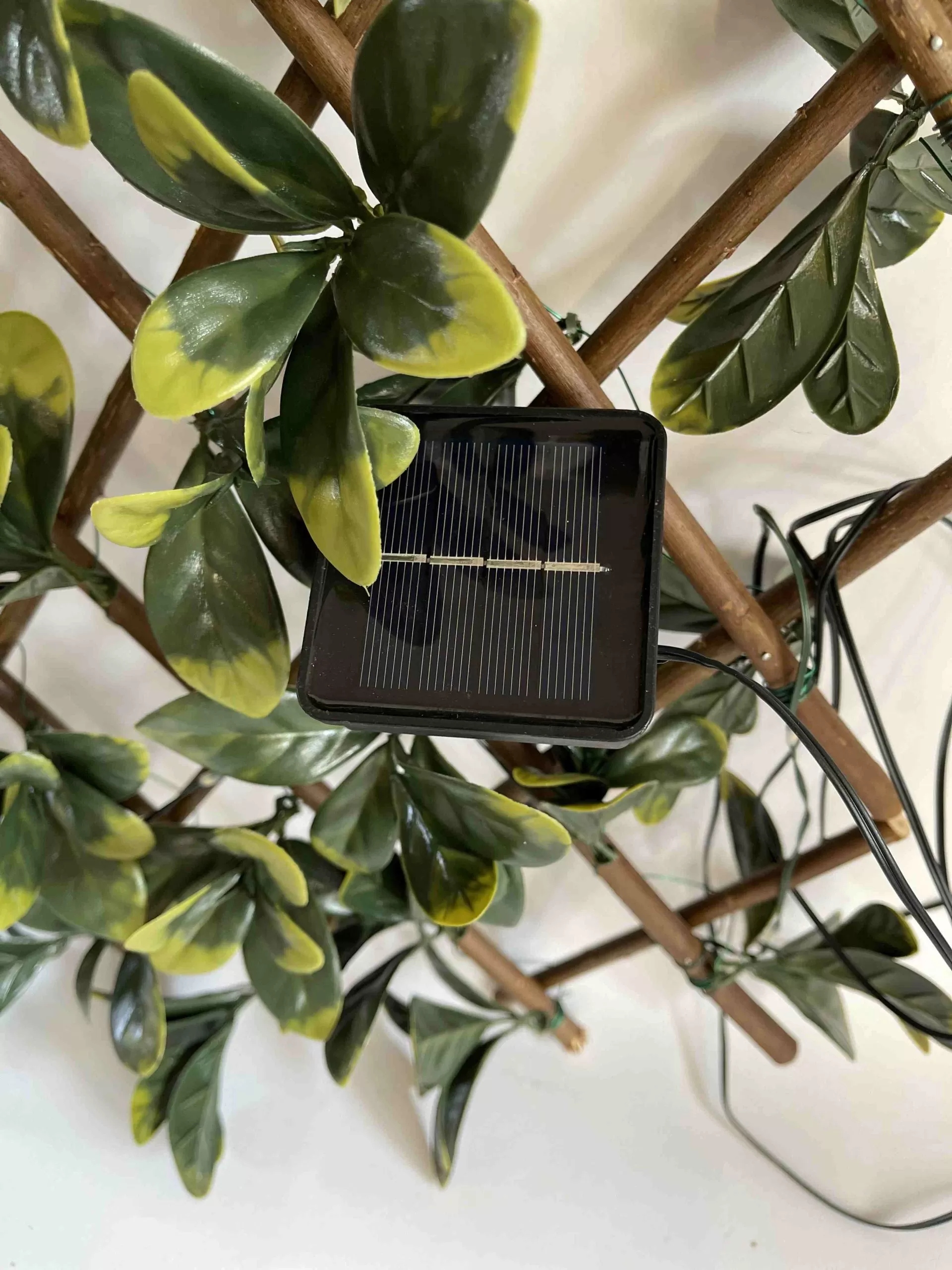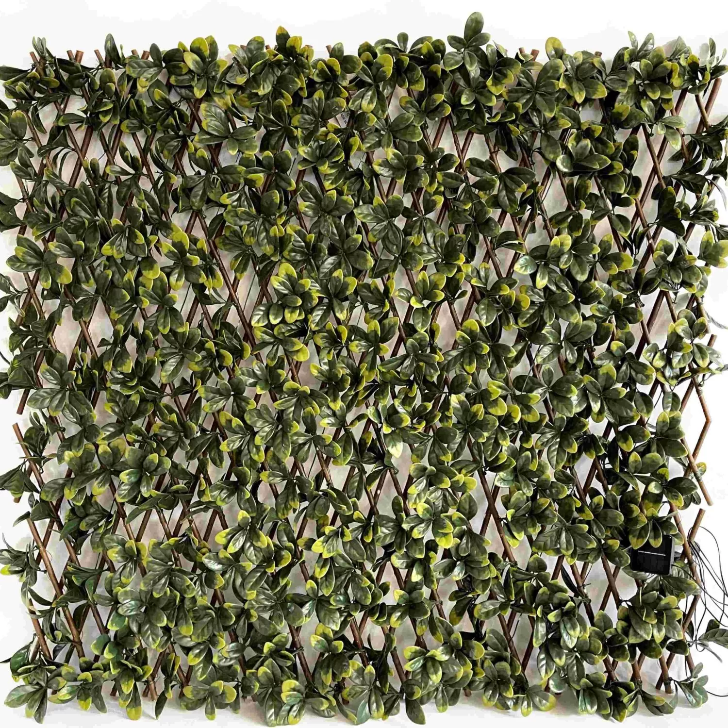 Naša umjetna PVC živica od pitosporuma je rastezljiva rešetka izrađena od bambusa koja se savija i rasteže u željeni oblik, dimenzija 100×200 cm, opremljena je sa 120 LED dioda i napaja se solarnom energijom.